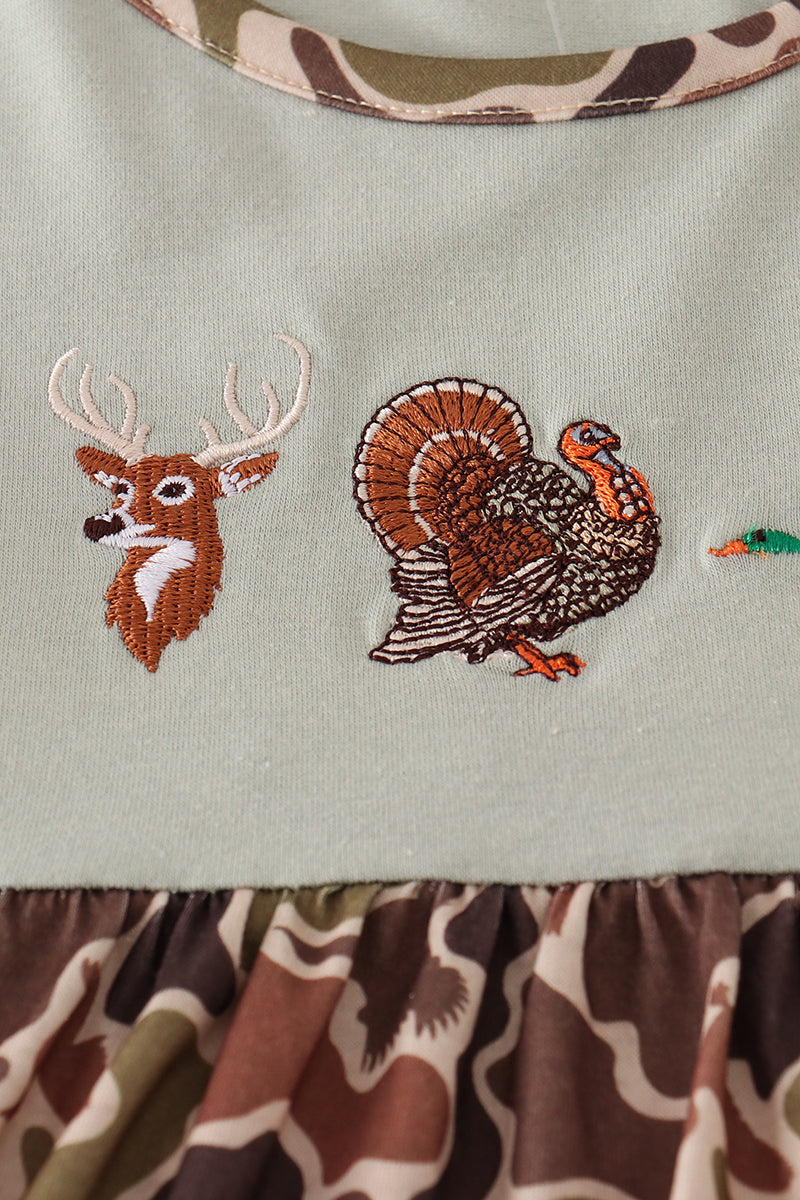 Get ready for your next adventure with this playful green camouflage hunting set! Featuring charming embroidery and fun ruffle details, these pants bring a fresh twist to classic outdoor style. Comfortable and cute, they’re perfect for blending into nature while standing out with personality.