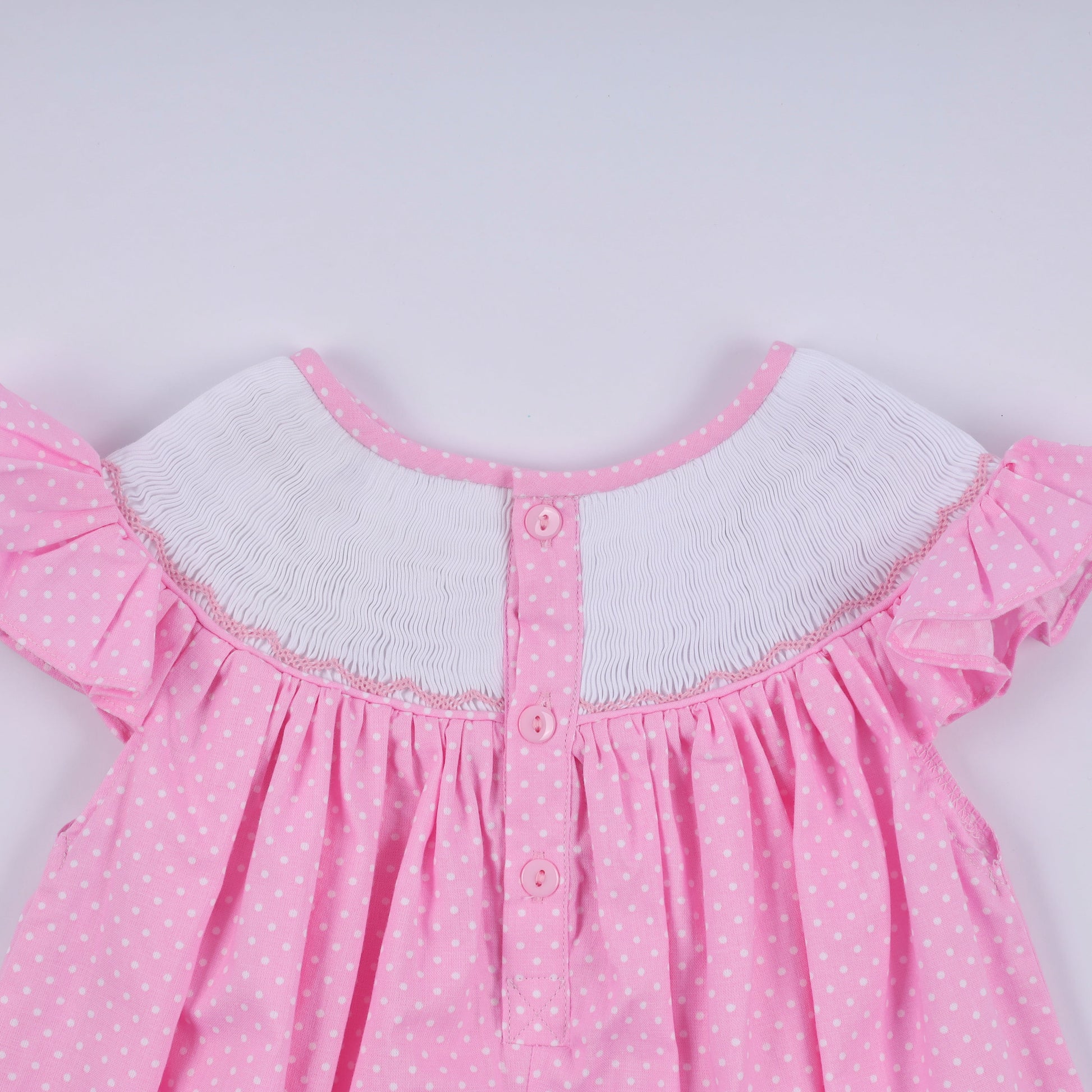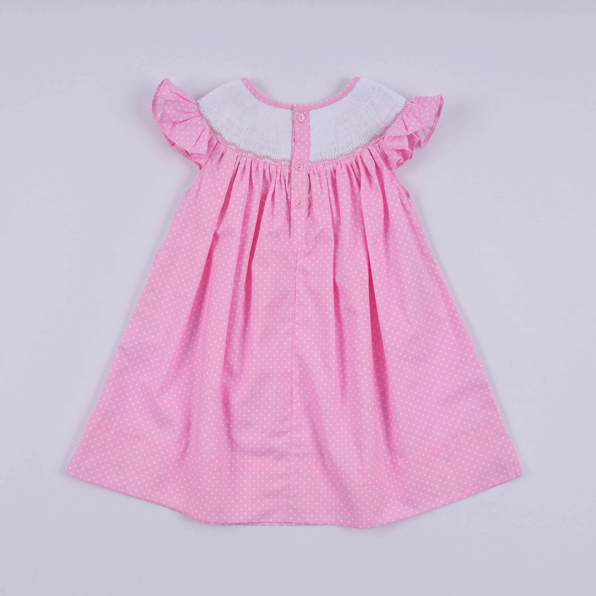 Pink character hand smocked dot ruffle dress