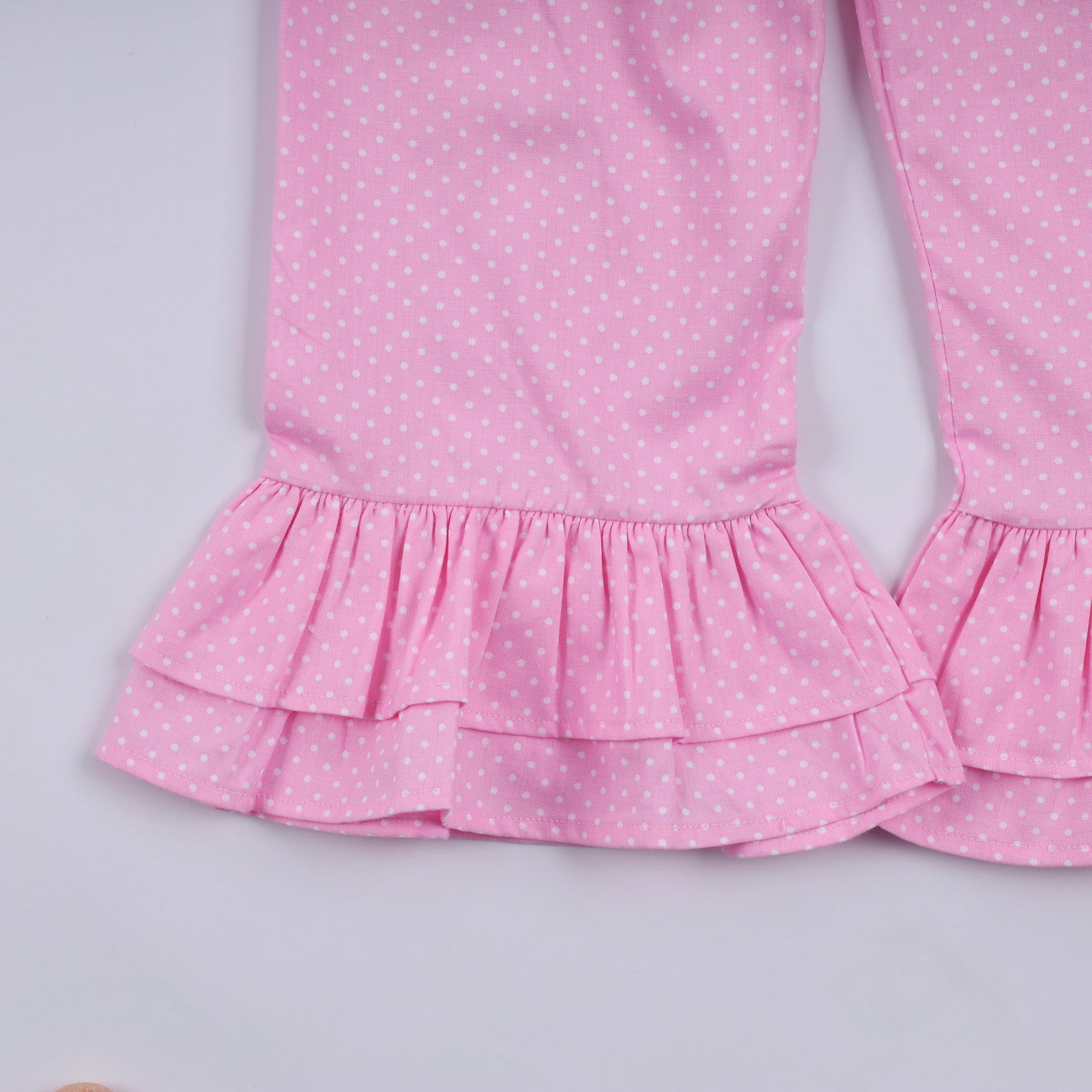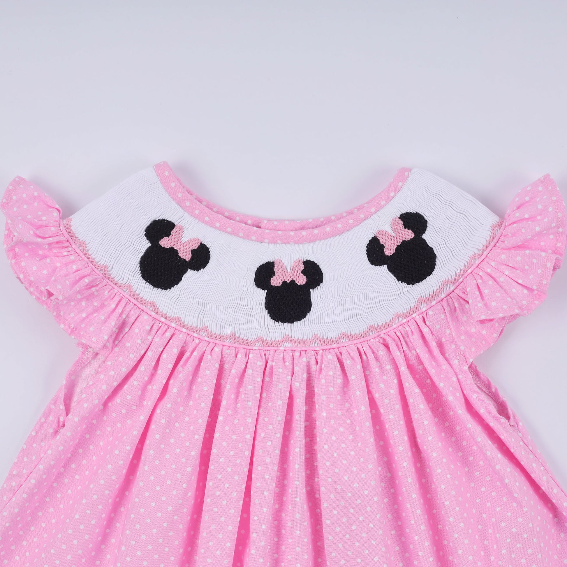 Pink character hand smocked dot ruffle pants set
