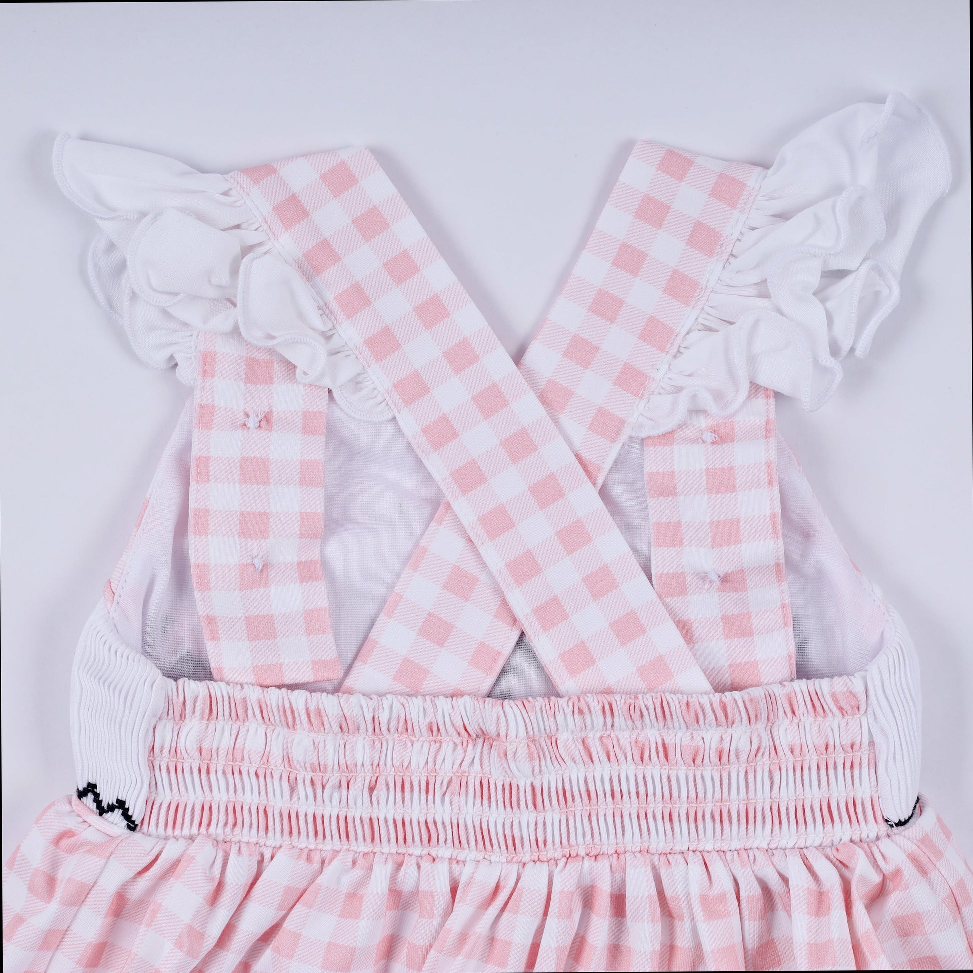 Pink character hand smocked gingham ruffle bubble
