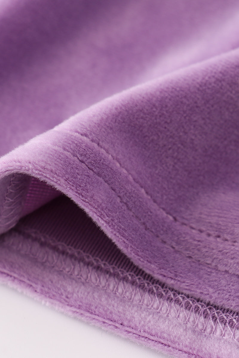 Step into whimsy with this purple butterfly print velvet ruffle pants set. Soft velvet fabric feels cozy while playful ruffles add a flirty touch. Perfect for lounging or making a stylish statement, this set brings comfort and charm together in one delightful package.